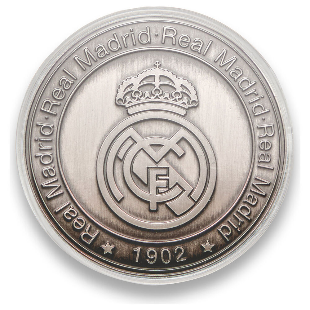 Moneda El Mejor Equipo del Mundo Real Madrid. Celebra la grandeza del club con la Moneda Oficial Real Madrid, El Mejor Equipo del Mundo en acabado níquel antiguo. Fabricada en aleación de zink (zamak) y grabada en relieve por ambas caras, llega protegida en cápsula acrílica (Ø 4,5 cm) dentro de una caja individual de coleccionista. Dimensiones de la moneda: Ø 4 cm (grosor aprox. 0,6 cm). Artículo de colección sin valor facial. Producto con licencia oficial REAL MADRID.