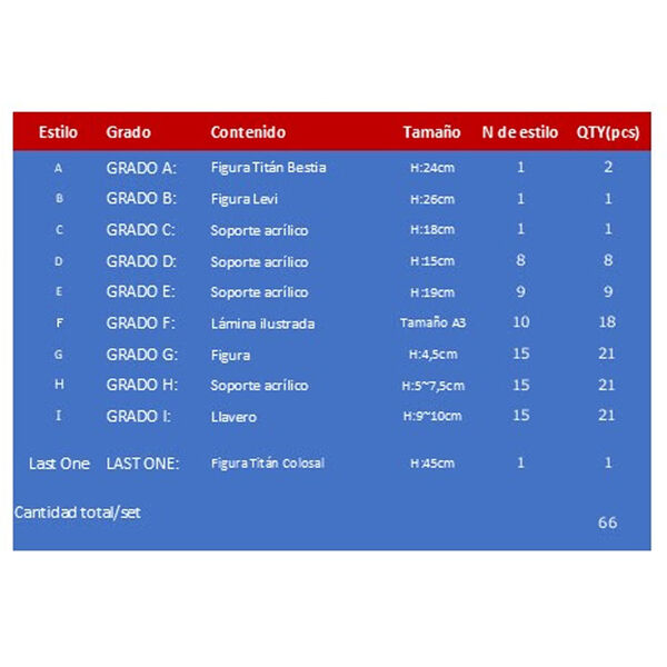 Pack Ichiban Kuji I Will Take Down The Beast Titan Attack on Titan. Lotería japonesa con productos de Attack on Titan. Contiene 66 productos y sus correspondientes 66 tickets sorpresa para canjearlos por los premios obtenidos. Además el ultimo ticket tiene un premio extra añadido al premio de la letra que salga. Esto hará que cuando empiecen a quedar pocos tickets, vuestros clientes compren todos los tickets restantes para poder llevarse el premio especial. Esta figura no se podrá conseguir de ninguna otra forma. Producto con licencia oficial BANPRESTO.