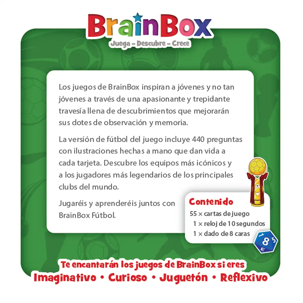 BrainBox Fútbol es un Juego de Cartas de la colección Brain Box para 1 o más jugadores, idioma español y para edades a partir de 8 años. Con una duración de 10′ por partida.