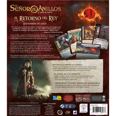 La expansión de saga El Señor de los Anillos: El Retorno del Rey contiene seis escenarios que recrean las emocionantes aventuras de El Retorno del Rey, la tercera parte de la epopeya de El Señor de los Anillos de J.R.R. Tolkien. Además, esta expansión incluye más de 60 cartas de Héroe y de Jugador que se pueden usar para construir o mejorar los mazos de Jugador de cualquier escenario o campaña de El Señor de los Anillos: El Juego de Cartas.
