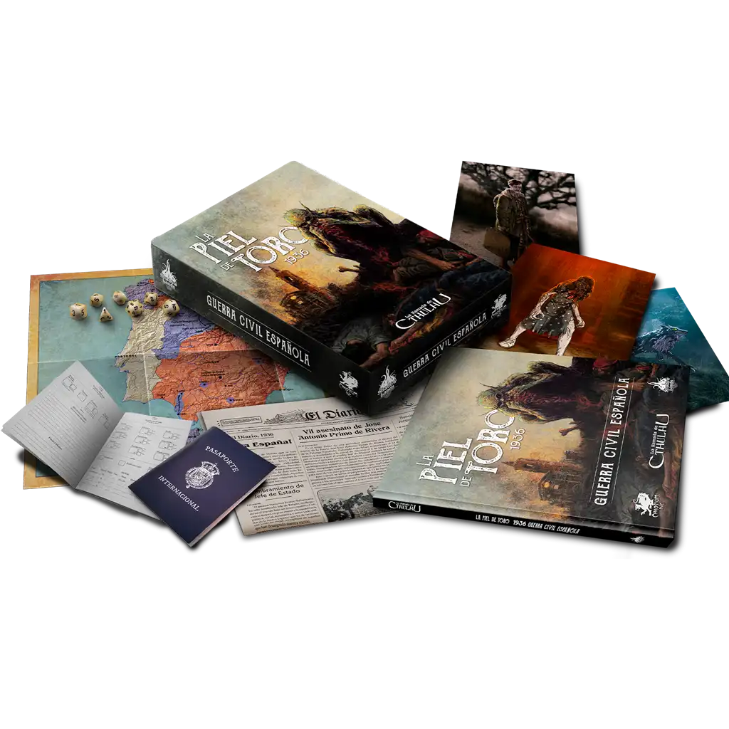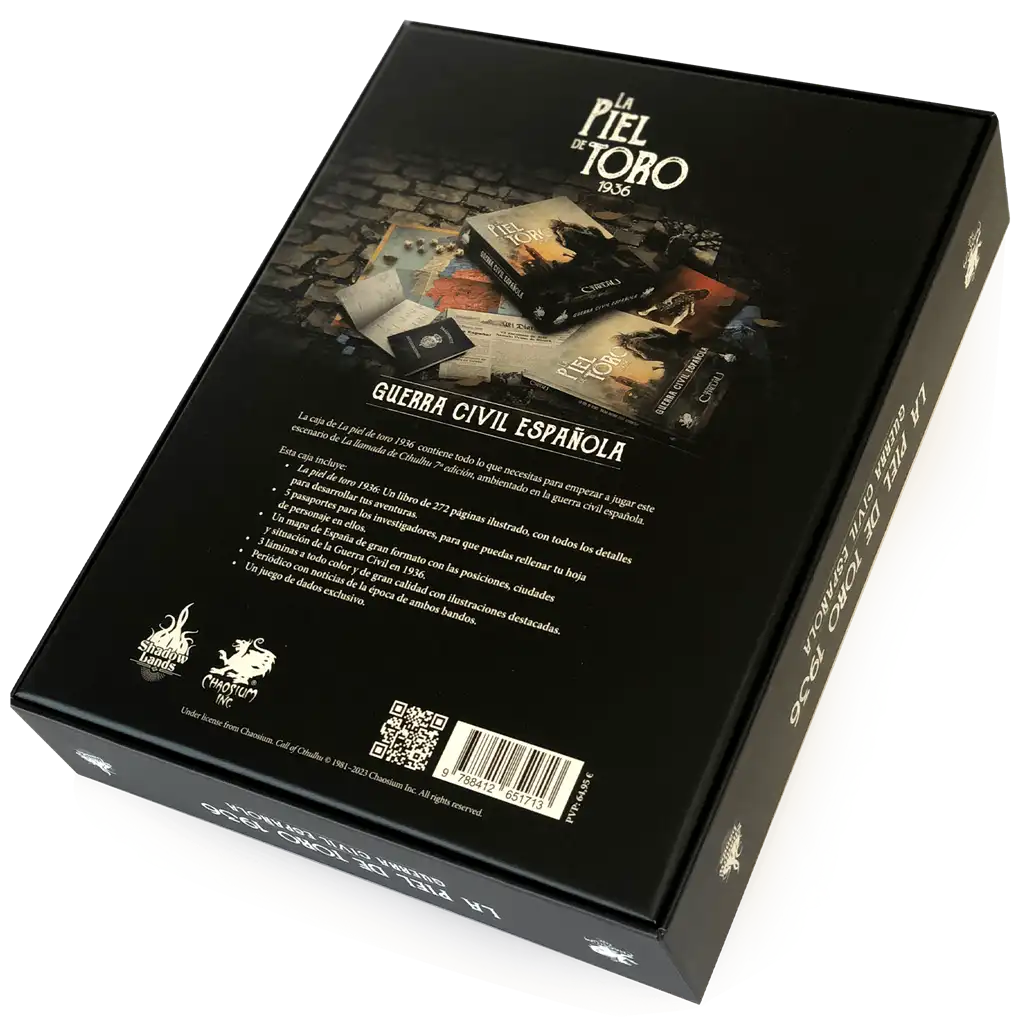 Caja La piel de toro 1936 es un Juego de rol de la colección La llamada de Cthulhu JDR para 2 jugadores, idioma español y para edades a partir de 18 años. Con una duración 30-120′ por partida.