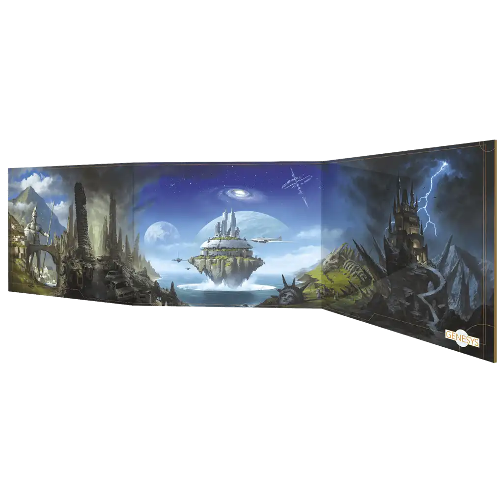 ¡Agiliza el juego, esconde tus notas e impresiona a los jugadores con la Pantalla del Director de Juego de GENESYS! Esta pantalla de tres paneles contiene las reglas y tablas que se consultan con mayor frecuencia para que tus partidas fluyan sin obstáculos.