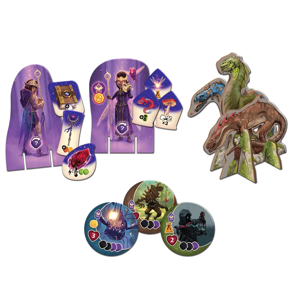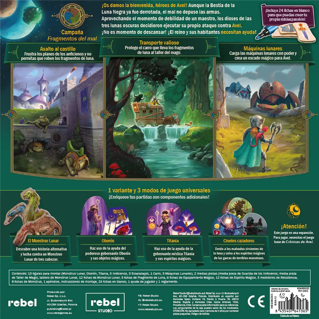 13 figuras para montar (Monstruo Lunar, Oberón, Titania, 3 Anficienos, 3 Excarabajos, 1 Carro, 3 Máquinas Lunares), 2 medias piezas (media pieza de Guarida de los Anficienos, media pieza de Taller de Mago), tablero de Monstruo Lunar, 12 fichas de Monstruo Lunar, 3 fichas de Fragmento de Luna, 8 fichas de Equipamiento Mágico, 12 fichas de Espíritu Mágico, 3 medidores de Resistencia, 6 fichas de Monstruo, 1 apéndice, instrucciones de montaje, 24 fichas en blanco, 1 ayuda de jugador y 1 reglamento.
