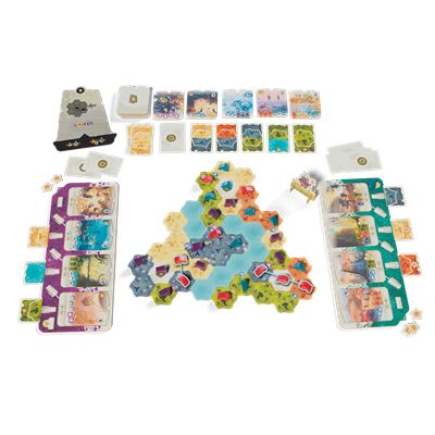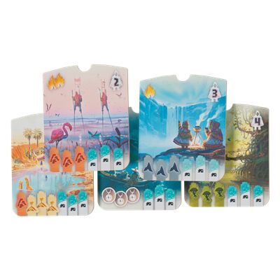 1 marcador de Dewan, 1 cuadernillo de puntuación, 10 piezas de Territorio, 55 cartas de Terreno, 24 piezas de Historia, 5 piezas de Escenario, 15 fichas de Baya, 36 Campamentos (9 de cada color), 4 tableros de Tribu, 1 pieza de territorio de Volcán, 1 pieza de territorio de Diluvio, 20 fichas de Pescado, 8 indicadores de Agua, 8 indicadores de Lava, 1 pieza de Evento