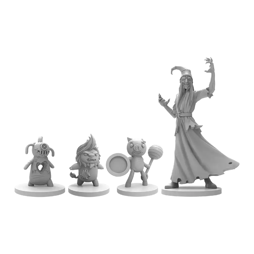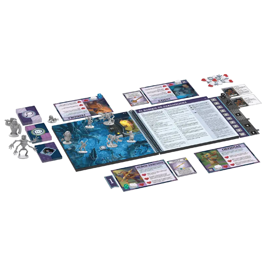 1 reglamento, 1 Libro de cuentos, 40 cartas de Hallazgo, 1 marcador, 6 miniaturas de Peluches, 17 miniaturas de Esbirros, 4 fichas de Juguete perdido, 1 bolsa de tela, 15 Botones, 6 tarjetas de Peluche, 29 cartas de Juguete perdido, 35 dados, 10 cartas de Sueño, 47 cartas de Objeto, 12 cartas de Esbirro, 7 cartas de Entorno, 34 cartas de Estado, 4 cartas de Ayuda, 32 fichas de Relleno, 16 fichas de Corazón, 4 fichas de Objetivo, 1 Marcapáginas, 1 ficha de Puerta, 1 ficha de Carrito de juguete y 1 ficha de Tren.