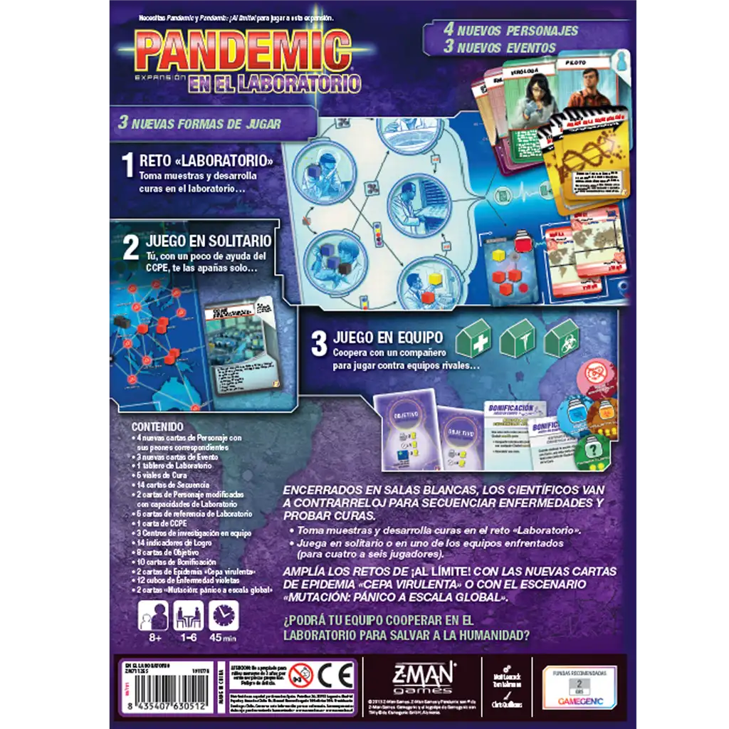 Pandemic en el Laboratorio es un Juego de tablero de la colección Pandemic para 1 a 8 jugadores, idioma español y para edades a partir de 8 años. Con una duración 45-60′ por partida.
