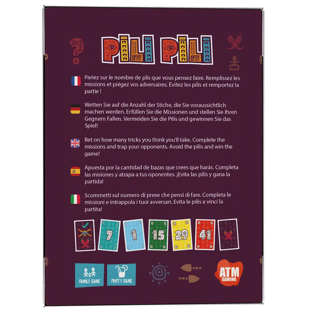 Pili-pili es un Juego de tablero de la colección Pili-pili para 3 a 6 jugadores, idioma español y para edades a partir de 10 años. Con una duración 15-45′ por partida.