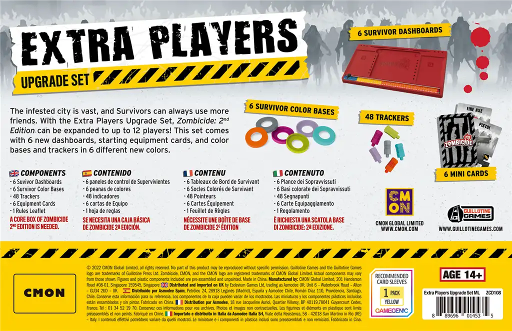 La gran ciudad está infestada de zombis, y a los Supervivientes no les vendría mal contar con más amigos. ¡Con este pack de ampliación para Zombicide 2ª edición podréis jugar partidas con un total de 12 jugadores! Se incluyen 6 paneles de control, cartas de Equipo inicial, peanas de colores e indicadores de 6 colores nuevos y diferentes.