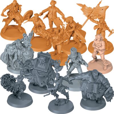 13 miniaturas, 73 cartas de Equipo, 6 cartas de Catacumba, 6 tarjetas de Superviviente, 100 cartas de Objetivo, 7 módulos de tablero de doble cara, 6 dados de A por todas, 23 fichas, 1 bloc de hojas de campaña, 1 cuaderno de reglas