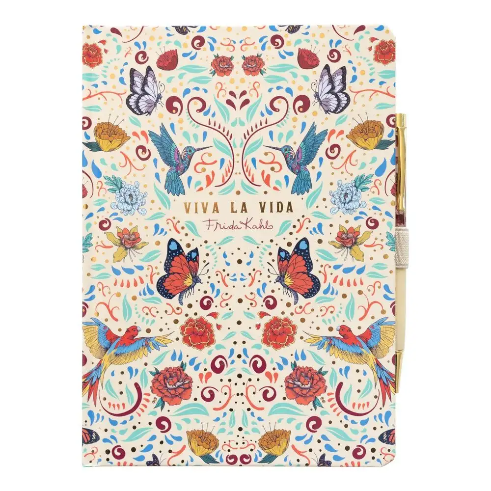 Set Cuaderno A5 + Boligrafo Frida Kahlo. Tamaño: A5. El cuaderno tiene 96 hojas. Cubierta de tapa dura forrada en tela con encuadernación encolada. Viene presentado en una caja de regalo. Producto con licencia oficial ERIK.